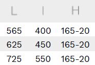 Medidas | 725x550x165-20 mm, 565x400x165-20 mm, 625x450x165-20 mm |